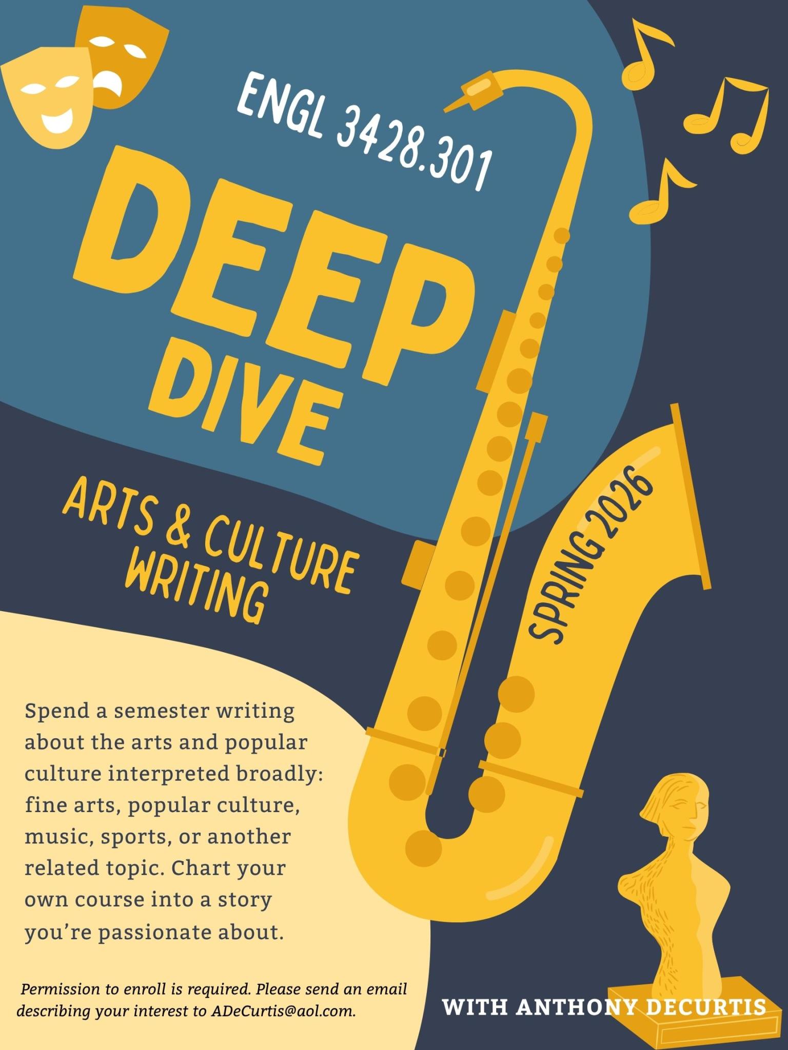 This course in writing about the arts and popular culture (interpreted broadly) is limited in enrollment and focuses on a semester-long project that each student defines in consultation with the instructor. The course will be run something like a group independent study, in which students pursue their specific, personal projects and share their work on an ongoing basis with the class as a whole. Ideally, students will informally serve as each other’s editors, sharing suggestions, sources, approaches and encouragement. Occasional meetings of the full group will concentrate on issues relevant to all aspects of arts-and-culture writing—including writing about the fine arts, popular culture, fashion, comedy, sports, or some other related topic—while meetings with individual students will focus and help realize the individual projects that will constitute the course’s main work. Writing produced in this course will typically be a lengthy feature (6,000+ words) of the sort that regularly appears in publications like The New Yorker, The New York Times Magazine or Rolling Stone. Other approaches to the project, however, will certainly be considered. Readings for the course will be geared specifically to the interests of the students who have been selected, and will be drawn from relevant work that is appearing at that time in journalistic publications. Ideally, applicants will have already taken Writing about the Arts and Popular Culture with the instructor, but that is not a firm prerequisite and other students should absolutely feel free to contact the instructor for more information. Permission to enroll is required. Please send an email describing your interest to ADeCurtis@aol.com.