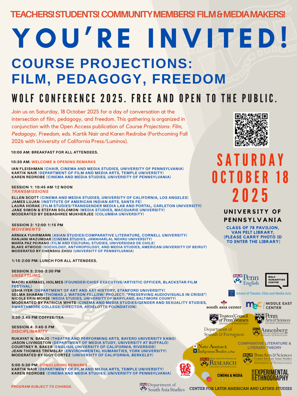Join us on Saturday, 18 October 2025 for a day of conversation at the intersection of film, pedagogy, and freedom. This gathering is organized in conjunction with the Open Access publication of Course Projections: Film, Pedagogy, and Freedom, eds. Kartik Nair and Karen Redrobe (Forthcoming Fall 2026 with University of California Press/Luminos).