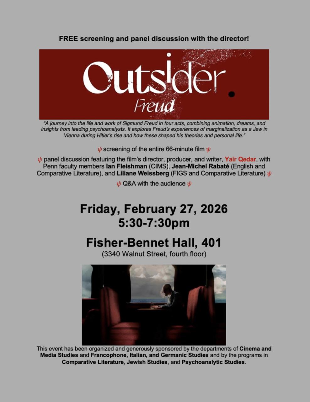 Screening of the film followed by a panel discussion featuring the film's director, producer, and writer, Yair Qedar, with Penn faculty memberse Ian Fleishman (CIMS), Jean-Michel Rabaté (English and Comparative Literature), and Liliane Weissberg (FIGS and Comparative Literature) and audience Q&A.