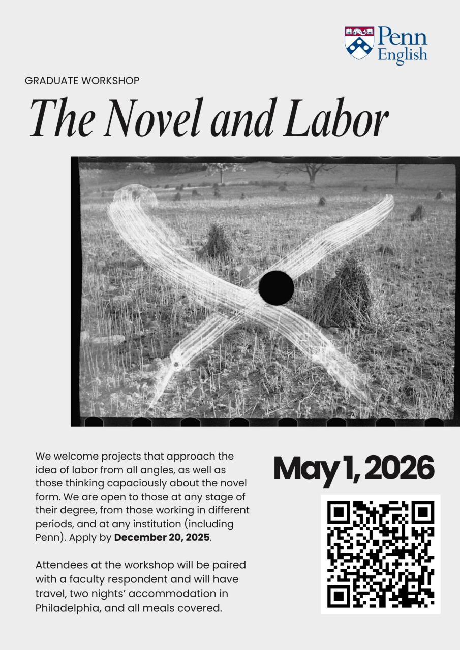 We are soliciting working papers from projects that approach the idea of labor from all angles (paid, reproductive, expropriated, intellectual), as well as those thinking capaciously about the novel form. We are open to those at any stage of their degree, from those working in different periods, and at any institution (including Penn).
